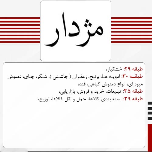 برند آماده مواد غذایی مژدار ، به شماره اظهارنامه 140250140001096432 ، مورخ: 1402/12/07  به شماره ثبت 477362 ثبت شده در طبقات 29،30،35،39  دارای زیرشاخه هایی از مواد غذایی خشک و چایی و دمنوش و خشکبار و ادویه ها و قند طبق جدول زیر و شامل کلمه ماخونیک به فارسی طبق نمونه  و یک برند فوق العاده جهت سرمایه گذاری و برندسازی با آوایی بسیار زیبا و فانتزی متناسب با نوع محصولات و فعالیت.