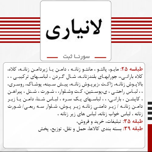 شرح کالاها / خدمات :  طبقه 25: مایو(زنانه)، پالتو ( اورکت )، مانتو زنانه با یقه خز، دامن یا زیردامن زنانه، کلاه، کلاه بارانی،کلاه متصل به لباس، جورابهای بلندزنانه، شال گردن خز، لباسهای ترکیبی که شامل کت وشلواروغیره میگردد، شال گردن خز زنانه، بالاپوش زنانه(زیرپوش)، ژاکت آستین دار،زیرپوش زنانه، پیش سینه(زیرپوش زنانه)، پوشاک، روسری، روسری یا شال گردن، زیردامنی زنانه(زیرپوش)، لباس راحتی زنانه، جورابهای ساقه بلندزنانه، پالتو پوستی،پوستین، کت وشلوار، پالتو، شورت زنانه، شنل زنانه، لباس پلیسه زنانه، جوراب زنانه، پیراهن زنانه، کاپشن بادی، لباس زنانه، روپوش زنانه، لباس بارانی، کاپشن، لباس زیر زنانه، لباسهای یک سره که معمولا دارای زیپ های طولانی درجلو هستند/روپوش زنانه، روسری/روسری یا شال گردن، مایو(زنانه)/لباس شنا، دامن یا زیر دامن زنانه / زیر دامنی زنانه زیر پوش، شلوار سه ربعی/ شورت زنانه ، لباس خواب زنانه، لباس های زیر زنانه ،