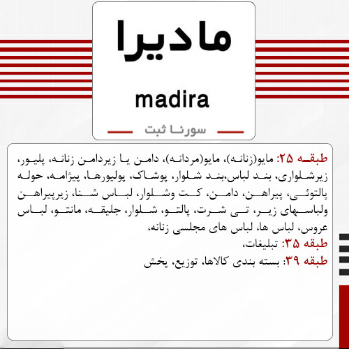 برند آماده پپوشاک مادیرا madira ، به شماره اظهارنامه 140350140001092703 ، مورخ: 1403/12/18  به شماره ثبت 503253  ثبت شده در طبقات 25،35،39 دارای زیرشاخه هایی از کلیه پوشاک و لباس  طبق جدول زیر و کلمات مادیرا madira به فارسی و لاتین و به رنگ مشکی طبق نمونه و یک برند فوق العاده جهت سرمایه گذاری و برندسازی با آوایی بسیار زیبا و فانتزی متناسب با نوع محصولات و فعالیت.
